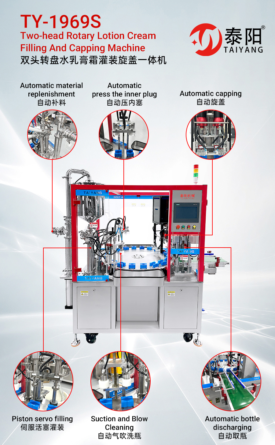 ဤ Taiyang နှစ် ဦး ခေါင်းနှစ်လုံးမှ Lotion Cream ဖြည့်စွက်ခြင်းနှင့် capping machine သည် lotions, creams နှင့်အခြားထုတ်ကုန်အမျိုးမျိုးအတွက်သင့်တော်သည်။ ဥပမာ - Lotions, Toners, Foundation အရည်, လိမ်းဆေး, အနှစ်သာရများ, မရှိမဖြစ်လိုအပ်သောအဆီများစသည်တို့ကို